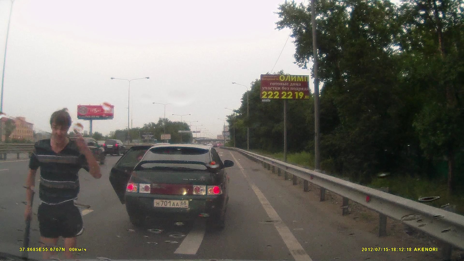 Вот и у меня так же, выезжала по полосе разгона на Новорязнское, он мчался шашечник по дороге как раз в мою полосу, обогнал, резко остановился передо мной, внутри еще несколько таких сидели, вышел, махал битой, ломал двери, в итоге двери ему не удалось сломать, разбил битой зеркало и уехал. Всё зафиксировано на видеорегистраторе. Только тут никто не останавливался, думаю потому что движение было достаточно быстрое.