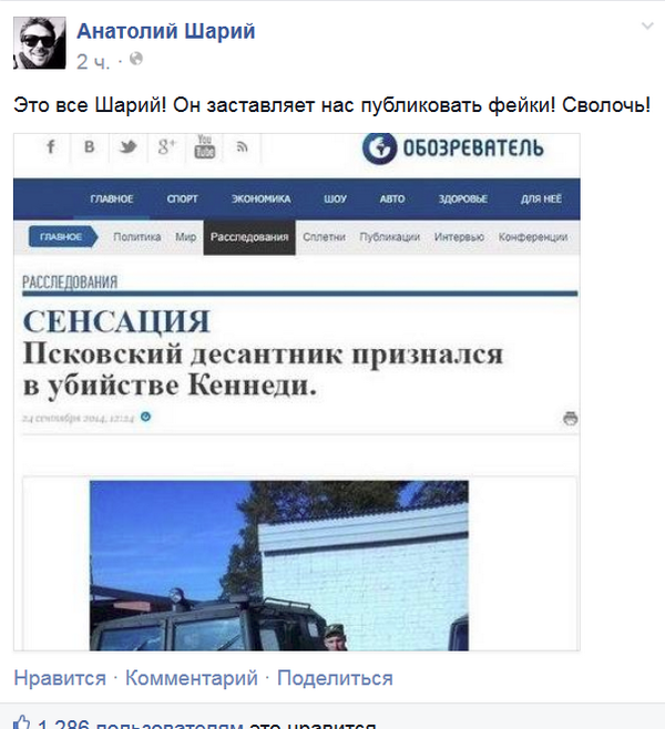 | Украина не сбивала Боинг. Во всяком случае намеренно. Просто так получилось! Не в первый раз. Украинский зенитный ракетный комплекс создал нештатную ситуацию на учениях НАТО и Украины в Черном море. Ракета, выпущенная с украинского противолодочного корабля "Тернополь", упала в воду, вынырнула и направилась в сторону корабля, однако не долетела и упала вновь. Украина. Неудачный пуск ЗРК ОСА-М с противолодочного корабля "Тернополь" U-209 === Из жизни! Каковы настроения у дончан, которые остались в городе сейчас? - Что до настроения простых людей, особенно пострадавших в результате боевых действий, то они, мягко говоря, не горят желанием жить в составе Украины. Про ополченцев и говорить нечего: я видел людей, у которых разрушены дома и они записались в ополчение. Эти ребята воюют за себя, за своих родных, за свою землю, они никогда не сдадутся. При нас на одном из блокпостов в ополчение пришли записываться отец и сын. Я своими глазами видел 14-летнего пацанёнка, у которого умерла мать, а папу убили украинские военные. Его называют сыном полка. Спросите у него, хочет ли он, чтобы Украина вернулась? .... - Будет ли ДНР ориентироваться на украинское или же на российское законодательство? - Что касается законодательства, то это вопрос больше к руководству республик, я же могу озвучить своё собственное мнение. Украинское законодательство не стоит демонизировать только потому, что оно украинское. Другой вопрос, что оно не соблюдалось все эти годы и не соблюдается сейчас. Спросите у простых граждан Украины, как часто нарушаются их права? Да буквально ежедневно! Насилуется Конситуция, не соблюдаются законы. Отсюда и корень украинских бед. Могу сказать, что мы в нашем проекте «Народный трибунал» квалифицируем преступления, совершённые украинской стороной именно по украинскому законодательству. И кстати, совокупность всех преступлений, совершённых Киевом — не только на Донбассе, а и на всей территории бывшей Украины — тянет на статью 442 УК «Геноцид». Мы убеждены, что придёт время и те, кого мы называем «хунтой», ответят за свои преступления на международном трибунале. ![]() | |